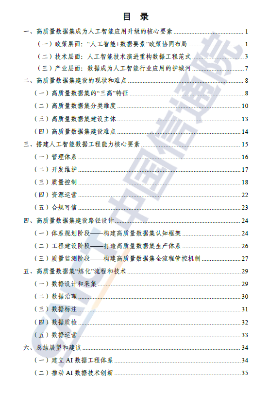 《指南》系统梳理了高质量数据集建设的背景,明确了高质量数据集的定义、特征、分类、建设主体以及“三大建设难点”,提出了人工智能数据工程的“五大核心要素”和企业建设高质量数据集“三步走”战略,分析了高质量数据集建设的核心技术,展示了各领域高质量数据集建设实践,并对未来高质量数据集建设的趋势进行了展望,为业界推进高质量数据集建设提供有力支撑。